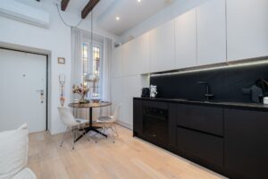 La proprietà è stata completamente ristrutturata con attenzione ai dettagli e viene venduta arredata, pronta per essere abitata fin da subito, ideale sia come prima casa sia come investimento. L’ingresso si apre su un moderno soggiorno con cucina a vista realizzata su misura, perfettamente integrata nell’ambiente e studiata per ottimizzare ogni spazio, creando una zona living conviviale e ben organizzata.